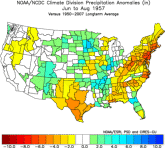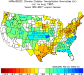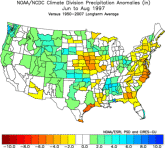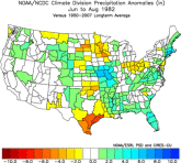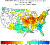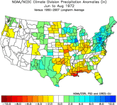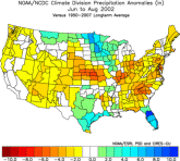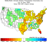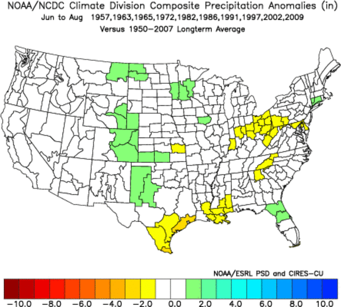 | There has been much speculation about whether the heavy and prolonged "monsoonal flow" precipitation early this summer into Southwest and the southern Plains has been a characteristic of the building El Niņo. Below are the precipitation anomalies for the years where the Oceanic Niņo Index was at least +0.5 for the May-Jun-Jul (MJJ) period and it was increasing, along with a composite map of all the years. Based on the composite there does not appear to me an overriding "signal". | |||||||||||||||||||||||||